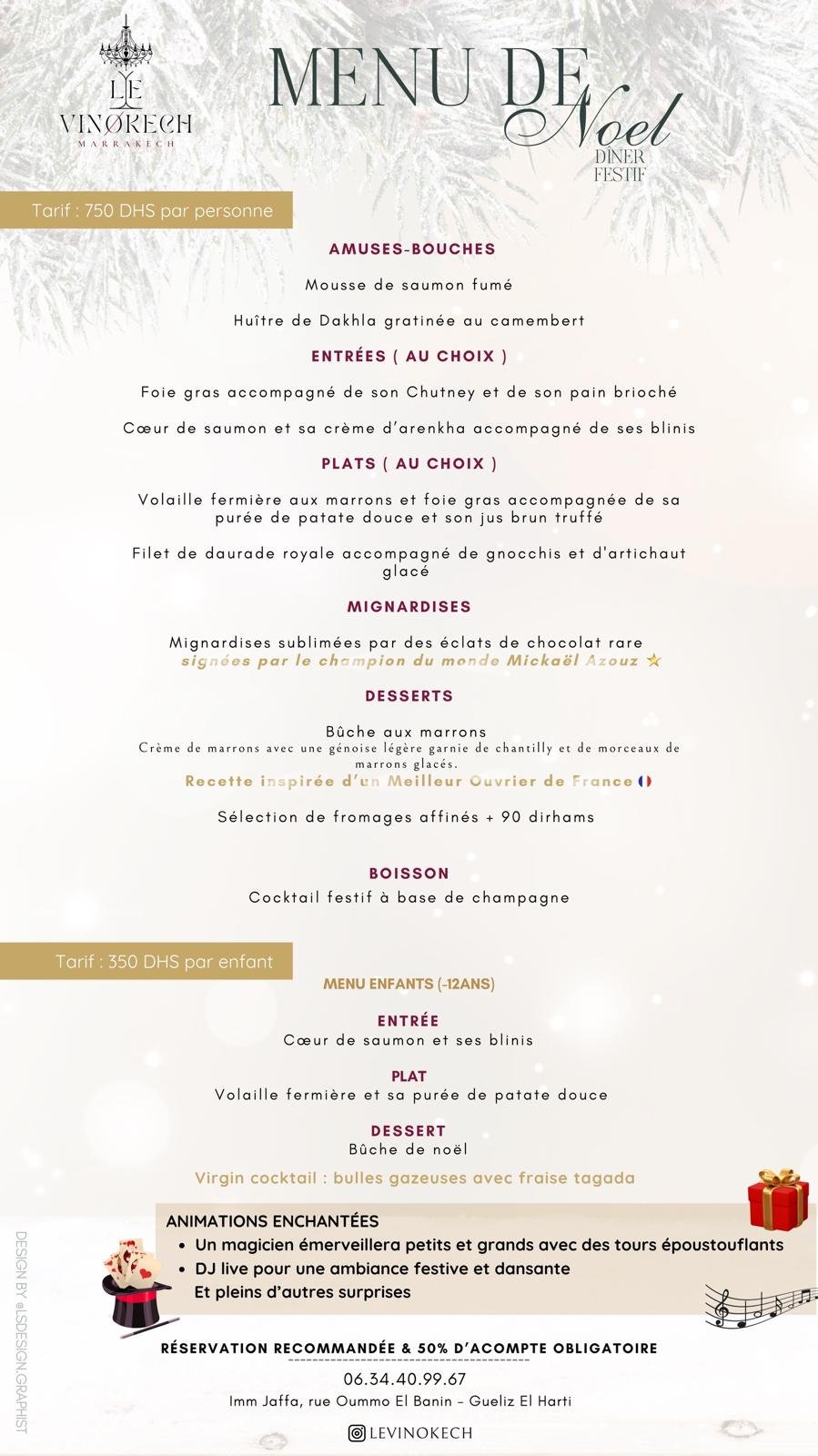 Pour les fêtes, le Vinøkech vous propose une expérience culinaire unique, où la gastronomie rencontre l’élégance. Découvrez un menu spécialement élaboré pour sublimer les saveurs de Noël, dans un cadre raffiné au cœur de Marrakech.